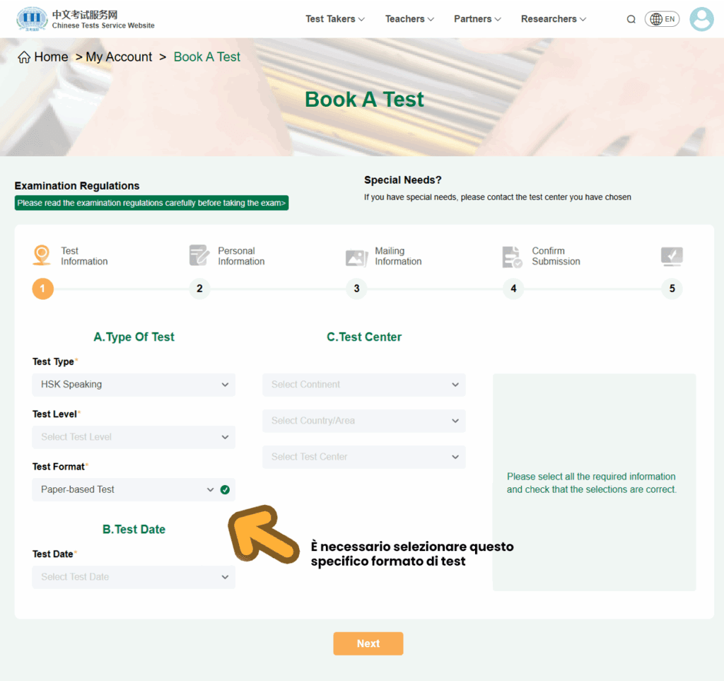 4) Dopo aver fatto l’accesso, prosegui con l’iscrizione all’esame compilando tutti i campi. Nel campo “Test Format” è necessario selezionare il formato “Paper based test”. Clicca su “NEXT”.