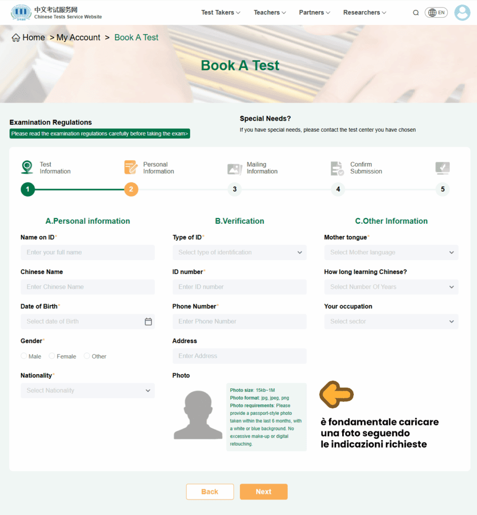 5) Continua la procedura e inserisci tutti i dati richiesti.  Preparate una foto tessera in formato jpg (la foto è obbligatoria). È fondamentale inserire numero di telefono e indirizzo email corretti per ricevere l’email di conferma contenente l’Admission Ticket (il biglietto di ammissione – indispensabile per svolgere l’esame).
